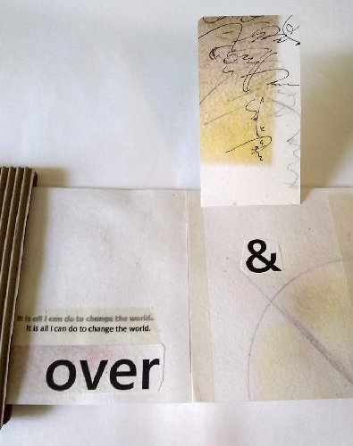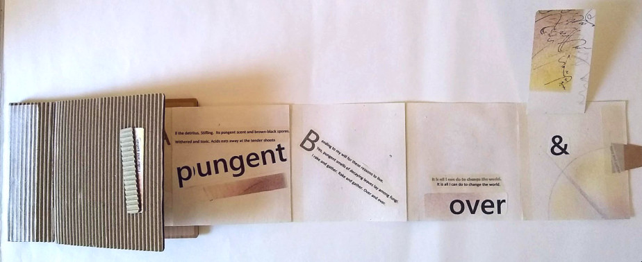 format to express the words and art. Images were originally drawn with color pencil and pastel and incorporate calligraphic lines, then printed on an inkjet printer. Using collage, both sides of the pages are components of the whole. First in a collection of small artist’s books (5″x7″) using recycled materials. Design and binding, images, handmade paper, and verse all by the artist. This piece was included in the exhibitio Small Is the New Big Exhibition (Juried) at the Rene Soto Gallery in Norwalk, Connecticut, 2020.