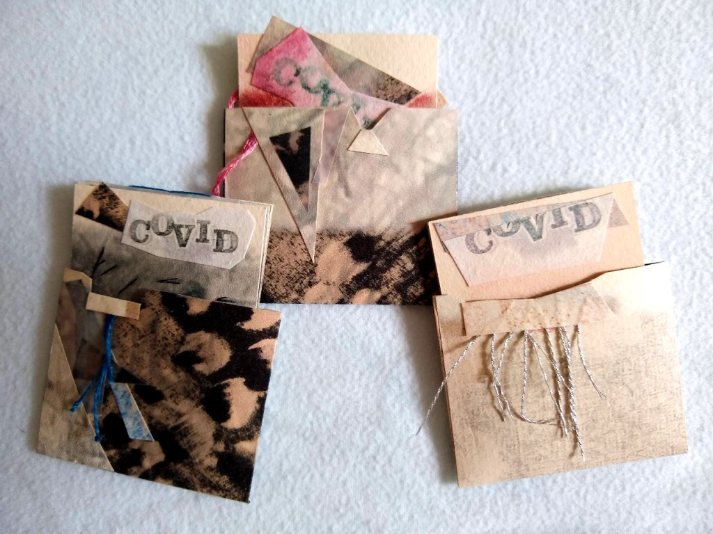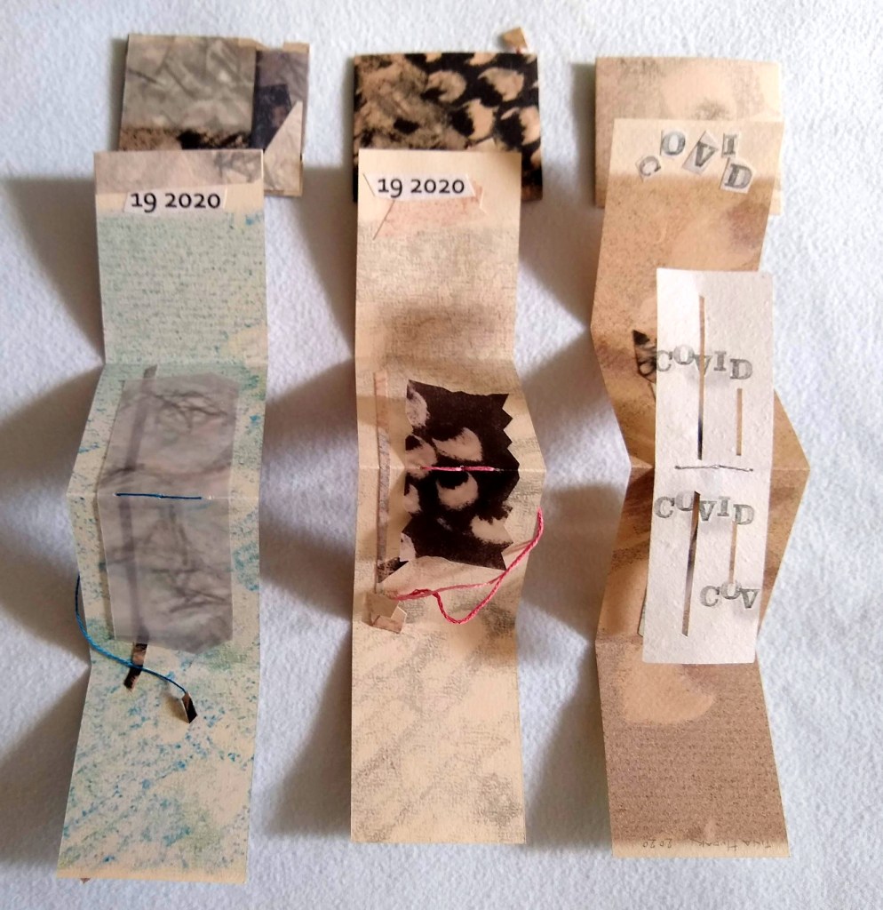 Each pocket contains a 2″ x 2-1/4″ accordion book. My original drawings are printed on Canson Mi-Teintes paper with a HP Photosmart C-4400 printer. Hand coloring, using sumi ink, Windsor Newton inks and chalk pastels, highlight the pages along with embroidery threads. Collage allows for depth in the COVID story. The structural format is credited to artist, Brooke Appler.