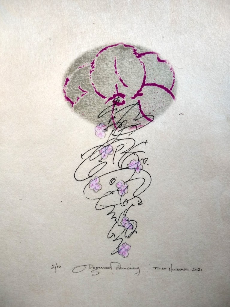 This limited edition (10 prints approx. 8″ x11″) combines three distinct images into one, adding hand painting to each after printing. Each is printed one at a time using an inkjet HP Envy 6075 printer on Japanese rice paper. Original image of dogwood is hand carved, then hand printed, adding calligraphic lines with a pointed pen.