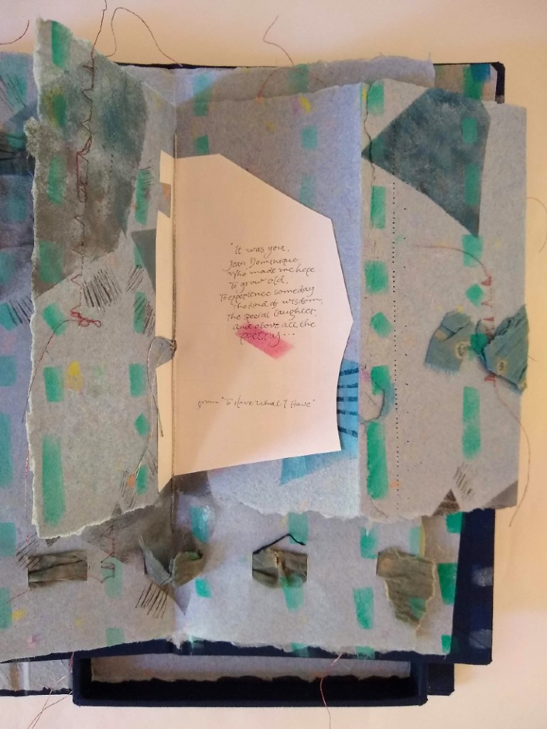 Unique artist’s book (5.5″ x 10.25″) within a box (7.5″ x11.5″). Using hand-dyed, cotton, handmade paper with overlays of folded sections, the book is a single stitch binding. Pages vary in size with overlays highlighting the poem with stencils, machine-stitching, and antique, cotton woven rug pieces throughout the book. Free hand calligraphy express verse written by the artist as a thank you to the author.