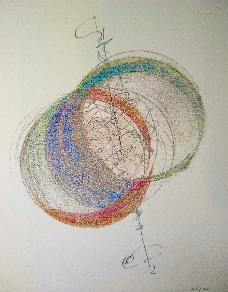 As a metaphor during this time of COVID19, our world is struggling with chaos in a finite time and place limited to two dimensions. We are lacking the third, “projective space” (depth), allowing us perspective. The darker calligraphic line is the still point which must be organic and fluid in order for us to find our center on multiple levels during this pandemic.
