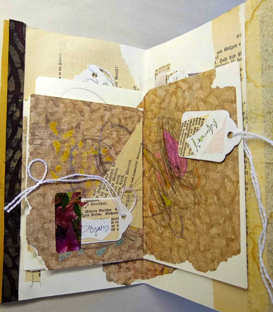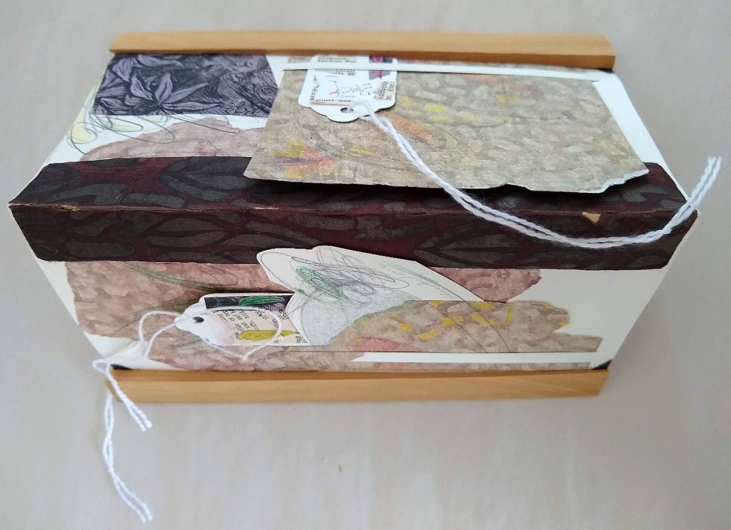 This one-of-a-kind artist’s book, 6.75″ x 4″ closed) uses a single stitch, three hole binding with pages in varying sizes. Several materials are re-used and adapted as the foundation: an pamphlet of Peer Gynt found in a used book store written in German with original cost of 50 pfennig; antique wallpaper that was discovered under plaster walls dating around 1901, and discarded wooden shims from a construction site. Artworks includes pencil drawings, calligraphy, woodcuts, with some hand coloring, and collage technique. This piece was included in the exhibition Small Is the New Big Exhibition (Juried) at the Rene Soto Gallery in Norwalk, Connecticut, 2020.