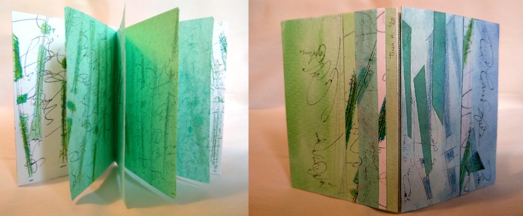 This artist’s book (2.5″ x 3/5″) is unique. Pages are made from fine linen and cotton, dyed, handmade paper. Using the imagery mentioned above, the art work is overprinted with subtle variations in color. Covers use “artist’s trading cards” and are a collage of hand drawn and colored art with calligraphy. Binding is linen fabric.