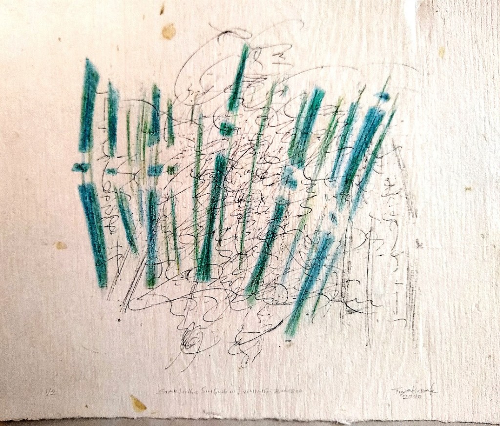 During the summer evenings one is able to hear the cacophony of starlings’ voices in our bamboo. Despite their dissonant sounds, it is soothing. These small works are my tribute to these commonplace members of the mynah [Sturnidae] family