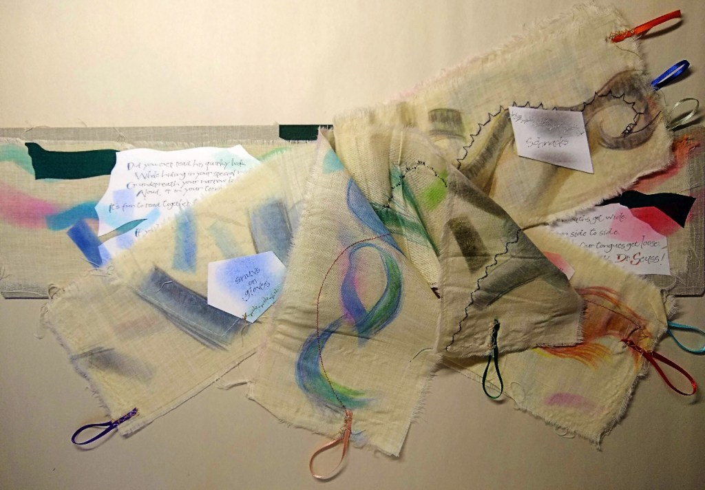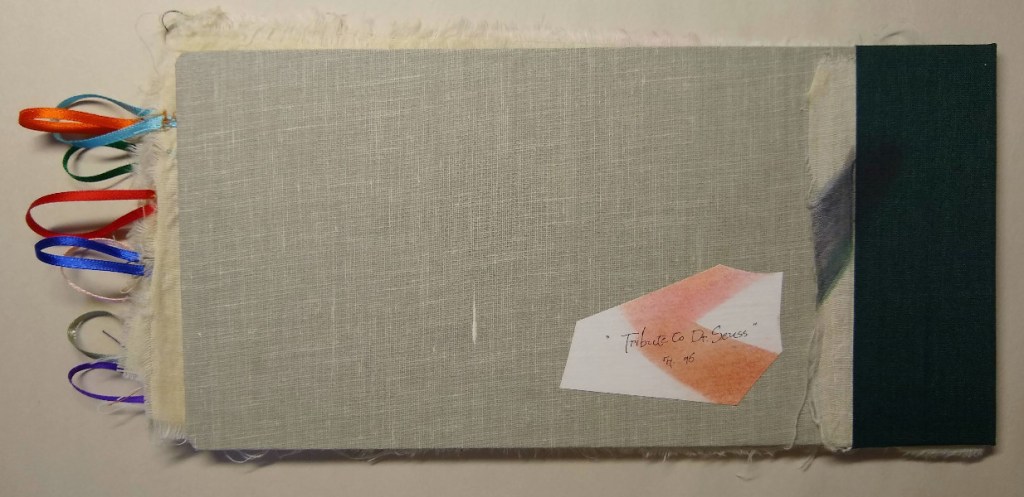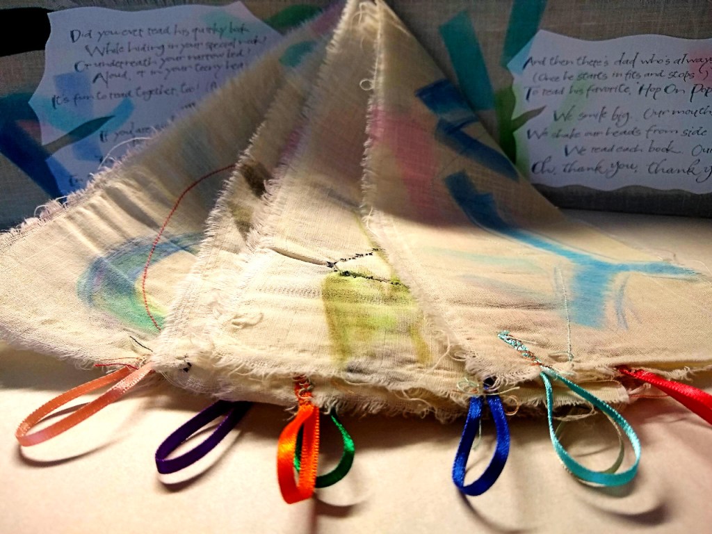 This unique artist’s book, approx. 10.5″ x 5″ uses a simple, single stitch binding. The verse is inspired by motherhood and the hours spent reading Dr. Seuss picture books to my children. Artwork, done on linen fabric, is a combination of pastel and color pencil. Imagery is hand drawn and reflective of the larger shapes seen in the Dr. Seuss books. Machine sewing with words written in calligraphy adds line and dimension. The calligraphic poem written to Dr. Seuss are the end papers.
