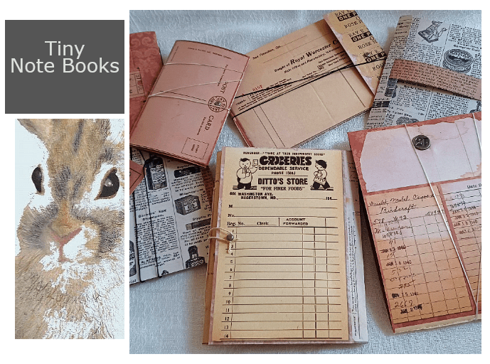 Each miniature notebook, approximately 4-1/2″x 5,” is hand crafted by Tina Hudak. All are three-hole bindings & closures. Some include extra notepaper and/or inside pockets. All vary slightly in design.